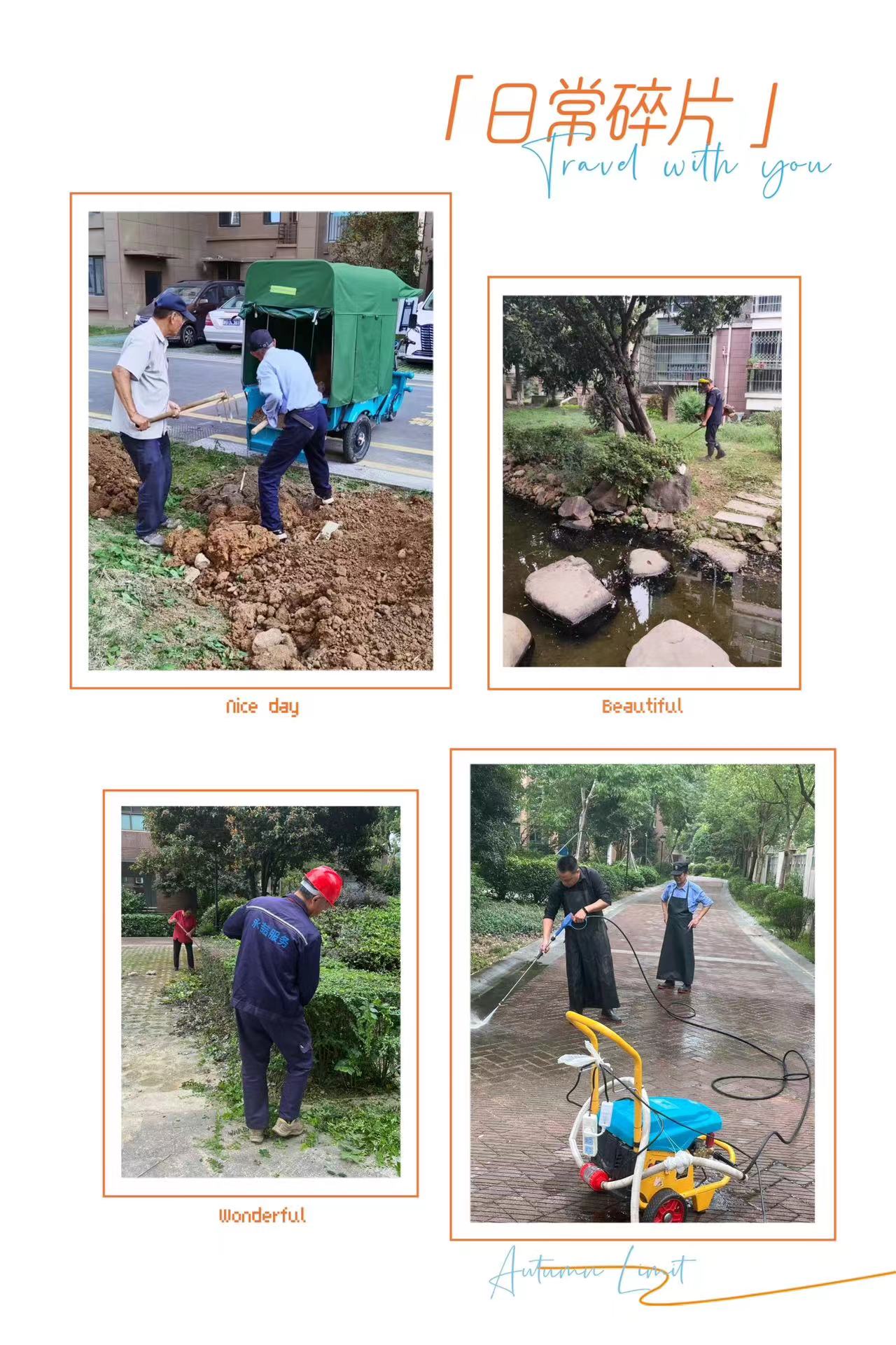 请看他们一个个大显身手的英武模样。在锦江华园小区,物业的花木工正在给经历过夏天猛长期的树木进行修剪。不一会儿功夫,原本枝繁叶茂的树木们就变得清秀可人。在小区的另一处流水沟前,经历冷空气造访之后,落叶枯枝铺满了整个水沟。我们的物业工作人员拿来工具,撸起袖子,不一会儿,小水沟又恢复了流水潺潺,伴着阵阵桂花香味,令人忍不住驻足停留。在东方名苑小区,一大早,我们的工作人员就在排查每一个走廊、过道的声控灯,他们时不时的停下来,爬上梯子检查、更换、安装,同样的动作,重复了无数遍。其实物业服务就犹如这些声控灯,只要业主有需要,我们一定为您点亮回家的路。在金声玉府小区,一个普普通通的工作日早上,大部分的业主已经上班上学,我们的项目经理和物业工作人员,也早早的穿着雨衣雨鞋,拿着高压水枪,细细的在冲刷小区内的每一条主干道。其实在每一次连绵的下雨天之后,我们金声玉府的物业工作人员都会进行这一项工作,就是为了保障我们全体业主的出行安全。每一次走进金声玉府小区,到访者都会忍不住感慨一句,好美丽的小区啊!