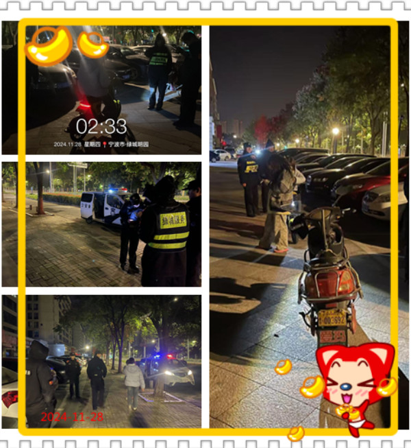 11月28日凌晨2:27分,绿城明园小区南门门岗队员夏邦美在商铺巡查时发现有异常情况发生,立刻通知监控中心 ,经监控员核实后确认为有可疑人员扒车门的事实后,及时通知班长许志文现场制定应对机制并报警,巡逻岗徐国太,许士文,岗亭站岗队员石郑鑫跟踪现场事实情况,于凌晨2:33分将两名可疑人员制服。2:55分时派出所警察到达现场,绿城明园保安队员将两名可疑人员交于警察并带至派出所。