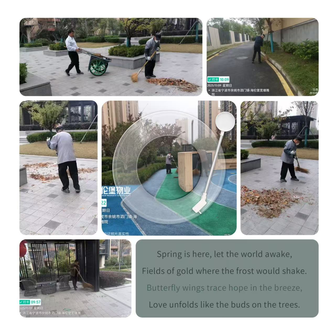 秋去冬来,园区里花草树木开始慢慢凋零,枯叶从树上纷纷落下,草坪上、主干道上处处都是金灿灿的落叶,给地面铺上了一层金色的地毯,远远望去,这些枯黄的树叶给小区增添了深秋别样的色彩,但也给我们小区的保洁人员增添了一份甜蜜的负担。