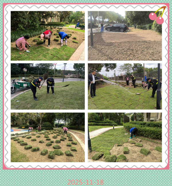 此次草皮更换工作,物业团队提前做好充分筹备。通过实地排查,精准确定需更换的老化、枯黄草坪区域;结合冬季气候特点及园区土壤条件,最终选定耐旱、耐践踏、适应性强的马尼拉草皮,其成坪速度快、景观效果佳,能有效提升冬季绿化观赏性。施工期间,工作人员严格遵循“清理旧草—翻耕松土—改良土壤—铺设压实—浇定根水”的标准化流程,合理调配人力与机械,抢抓晴好天气高效作业,同时安排专人全程监督施工质量,确保草皮铺设平整、根系与土壤紧密结合,保障成活率。