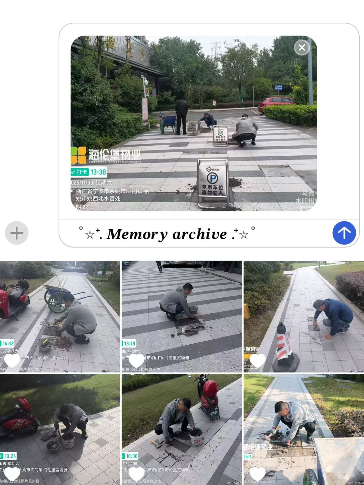 宽塘雅院园区部分区域的地砖因被车辆碾压或热胀冷缩等原因,出现了拱凸不平、裂开的现象,不但给业户的出行带来不便,同时也影响了小区的整体形象。对此,物业服务中心组织员工自己动手,对破损地砖进行更换。工作人员拿来了铁锹、电钻、推来了中沙、水泥,将破损路面全部挖开,重新填充修补,对破损道路进行了维修,为了防止业户不慎踩踏并对维修的路面添加了路障。经过对路面的修补,小区道路焕然一新,为业户创造了安全出行的生活环境,得到小区业户的普遍好评。