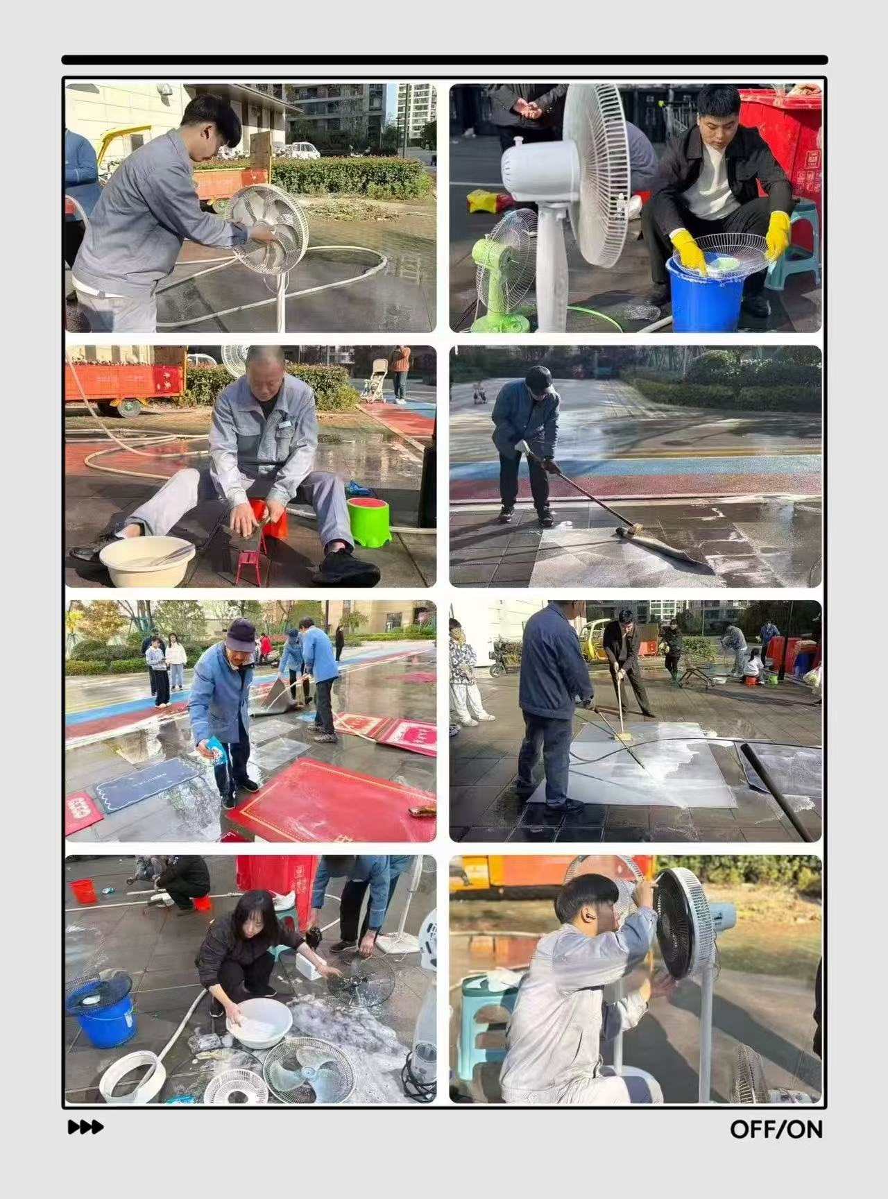 另一边的洗地垫、洗风扇区域,同样一派忙碌景象。物业工作人员提前备好高压水枪、清洁剂和水桶,业主们抱着沾满灰尘的地垫、积了污垢的风扇前来,工作人员立刻上前接过,先用清洁剂喷洒浸泡,再用高压水枪仔细冲洗。水柱冲刷下,地垫上的油污、灰尘顺着水流褪去,原本暗沉的图案重新变得鲜亮;拆开的风扇罩和扇叶,经过擦拭、冲洗,也告别了厚厚的灰尘,露出干净的底色。“你看这地垫洗得多干净,跟新买的一样!”业主王先生举着冲洗好的地垫,向身边邻居展示,脸上满是满意。对于行动不便的老人,工作人员还主动帮忙搬运沉重的地垫和风扇,清洗完毕后细心擦干,再送回业主家中,让温暖不止于 “服务”,更在于“贴心”。