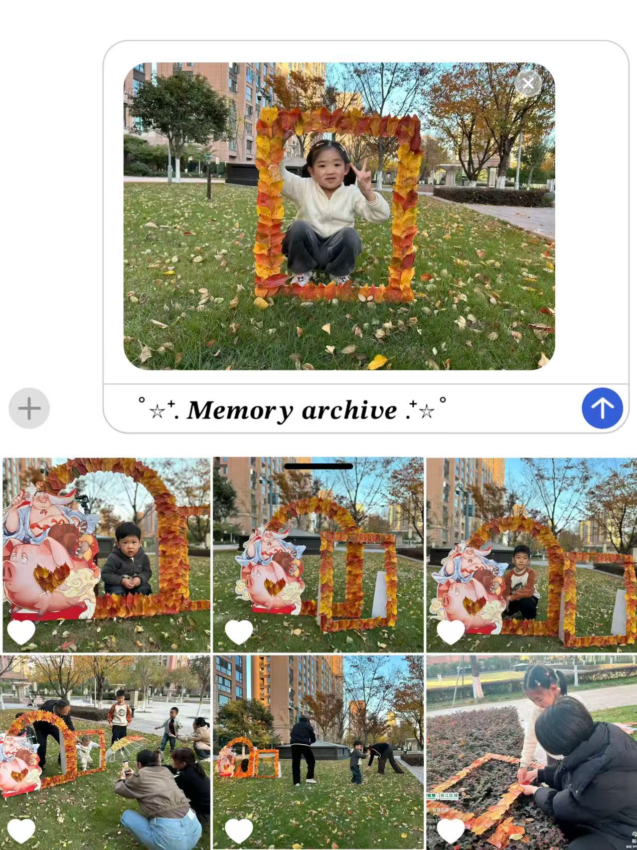 走进园区草坪,一个个精心搭建的KT板相框瞬间抓住眼球!物业工作人员化身“秋日艺术家”,将收集来的色彩斑斓的落叶,层层叠叠地点缀在相框边缘,阳光洒下时,落叶的纹理与光影交织,每一个相框都成了独一无二的秋日限定背景板。无论是单人定格、闺蜜同框,还是家庭合影,往相框前一站,就能轻松拍出满屏秋意的氛围感大片,刷爆朋友圈!