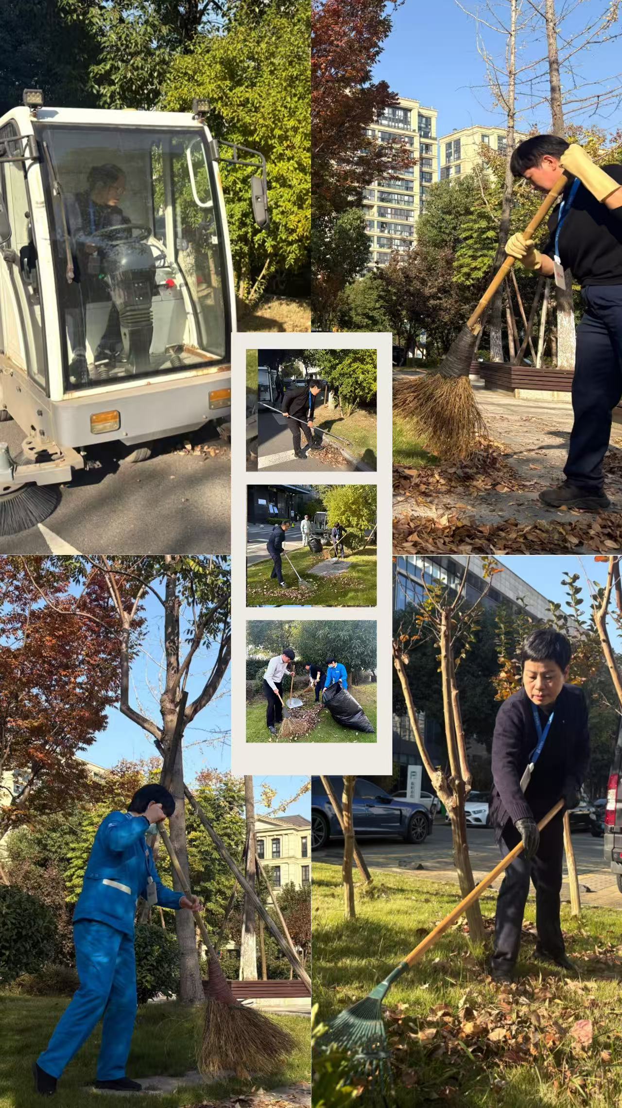 下午,在简短的工作安排后,大家按计划分组行动,迅速投入到清扫工作中。有人手持扫帚,将人行道和停车区域的落叶逐一归拢;有人使用耙子,细致清理绿化带深处和灌木根部的积叶;而机扫车也全面启动,沿院内主路缓慢行驶,高效吸扫路面的落叶与杂物。