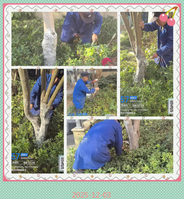 此前,业主通过多渠道反映树木存在虫洞及冬季冻裂等顾虑,科创新城小区项目部迅速响应,筹备涂白工作以解决居民困扰。现场,物业人员分工协作,使用生石灰、硫磺等环保材料制成的专用涂白剂,对树干1.2 米以下部位均匀涂刷,重点覆盖树皮缝隙等区域。据悉,涂白可杀灭病菌和虫卵、调节树干温差,为树木越冬筑牢“防护墙”。这种涂白处理不仅能有效杀灭树干表皮及缝隙中的病菌、虫卵,阻止害虫爬树产卵,减少来年病虫害发生;还能反射阳光,降低冬季树干昼夜温差,避免低温冻裂和夏季高温灼伤,为树木安全越冬、健康生长保驾护航。此外,工人师傅们还根据不同树木的习性特点,进行清理修剪,以提高小区树木的防寒抗冻能力。