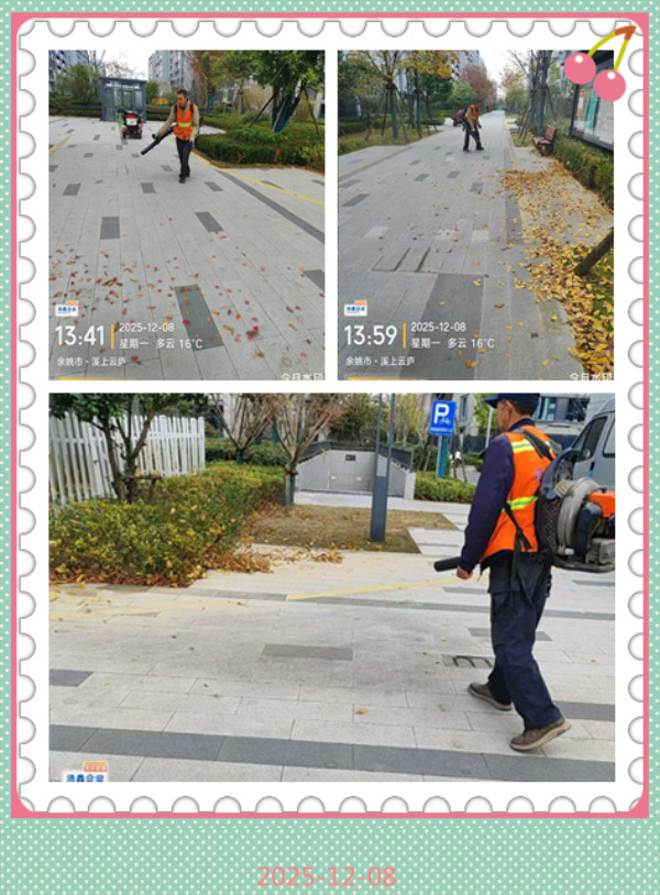 近日,工作人员利用大功率鼓风机,对小区内的落叶进行了快速有效地清理。随着鼓风机来回摆动,原本散落在草坪上的落叶不断翻飞、滚动,并最终被集中堆积到一起。这种鼓风机不仅风力强劲,而且操作灵活,能够在树下、灌木丛等相对狭窄的空间内自由穿梭,大大提高了清理效率。每到秋冬季节,浩鑫物业会启动“每日多频次清扫”模式,例如在清晨7点前完成主干道、单元门口等核心区域的清扫,正午和傍晚再加密巡查,确保落叶随落随清,避免堆积滑倒等隐患。清扫通常以人工为主(保洁员使用扫帚、簸箕等工具),重点区域如绿化带会细致捡拾以保护绿植,同时配合鼓风机等机械提高效率。