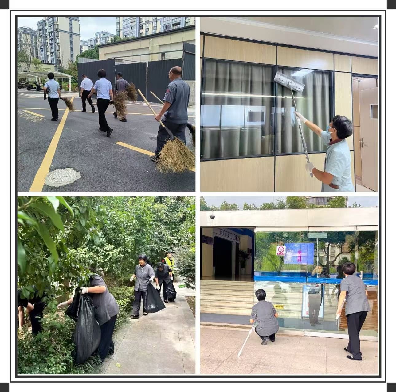 双节前,各项目处掀起“全员大扫除”热潮。保洁团队带着扫帚、抹布、高压水枪全员上阵,从小区大楼绿化带到医院楼梯扶手墙面到景区地面瓷砖缝隙再到停车场设施设备,不放过任何一处细节。安保、工程人员也主动加入,协助清理公共设施周边杂物;客服人员负责各项目会议室的清洁。这场大扫除,用最朴素的行动践行“用细致保洁,让家园净起来”的服务初心,为节日换上干净“新装”。