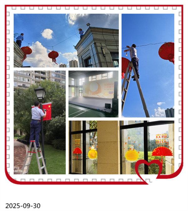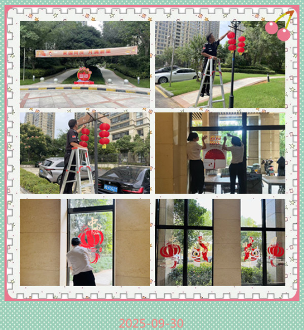 金秋送爽,丹桂飘香。在国庆与中秋双节来临之际,乔登国际花园物业服务中心联合梨洲街道新桥江社区,精心筹备了“家国同庆 月满浙里”主题活动,为小区披上节日盛装,让业主们提前感受浓厚的团圆与喜庆氛围。连日来,物业服务中心的工作人员分工协作,有条不紊地为小区装扮。秩序人员登高作业,在灯杆上悬挂起串串红灯笼,随风摇曳的灯笼为小区增添了一抹亮色;工程部则在景观道路两侧挂满鲜艳的五星红旗,处处洋溢着爱国情怀;客服人员手持窗花,细心地贴在各单元门玻璃上,将节日的祝福送进每一户家庭。小区入口处的大灯笼更是格外醒目,成为迎接业主回家的温馨标志。